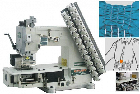 Машина предназначена для образования декоративных сборок при помощи эластичных нитей (резинки-«венгерки»), заправленных в петлители (в иглах – обычные нити) на женской и детской одежде из легких и средних по толщине тканей и трикотажа
