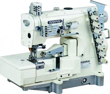 Четырехигольная высокоскоростная плоскошовная машина с верхним и нижним застилом с плоской платформой для выполнения «ракушечного шва» и окантовки.