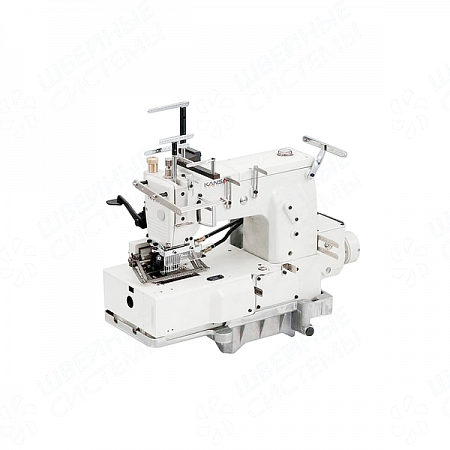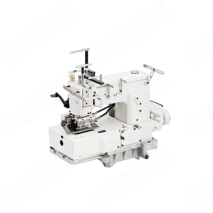 Двенадцатиигольная машина двойного цепного стежка с плоской платформой для выполнения поперечной сборки и с декоративным верхним застилом, с заправкой эластичной резинки в петлитель, с пуллером.