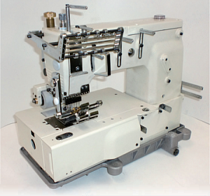Двенадцатиигольная машина двойного цепного стежка с плоской платформой для настрачивания «лампасов», с пуллером.