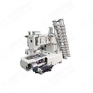 Двенадцатиигольная машина двойного цепного стежка с цилиндрической платформой для притачивания резинки, с пуллером, устройством дозированной подачи.