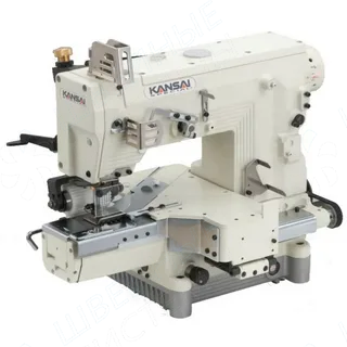 Четырехигольная машина с цилиндрической платформой для притачивания резинки, с последовательно расположенными иглами, с механизмом горизонтального хода петлителя, с пневматической обрезкой нити и подъемом лапки.