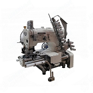 Пятиигольная машина с цилиндрической платформой для втачивания резинки в пояс, с последовательно расположенными иглами, с механизмом горизонтального хода петлителя.