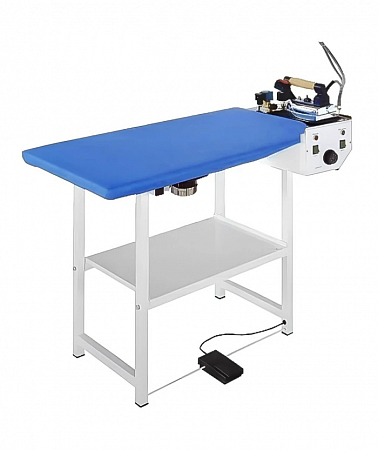 Прямоугольный утюжильный стол (115x62см) с встроенным парогенератором (1,5л), электронагревом рабочей поверхности и вакуумным насосом.