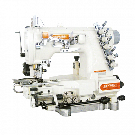 3-игольная 5-ниточная плоскошовная (распошивальная) машина цепного стежка с цилиндрической (рукавной) платформой, верхним и нижним застилом, с устройством для подачи эластичной тесьмы, пуллером зубчатого типа, приспособлением для подгибки среза.