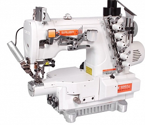Трехигольная распошивальная машина с узкой рукавной платформой и встроенным серводвигателем.