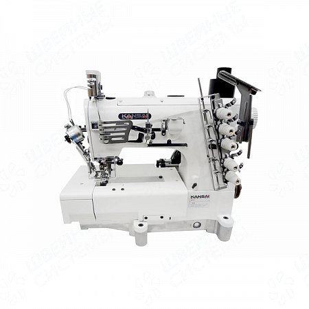 Трехигольная высокоскоростная плоскошовная машина с верхним и нижним застилом с плоской платформой 4 в 1 (В комплект машины включены сменные комплекты для распошива, подгибки и окантовки (машина-трансформер) ) с электрической обрезкой нити и подъемом лапки.