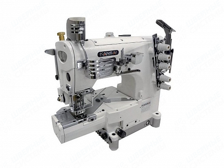 Трехигольная высокоскоростная плоскошовная машина с верхним и нижним застилом с цилиндрической платформой (диаметр 90 мм) с широкой рейкой (для распошива оверлочных швов).