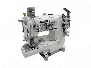 Трехигольная плоскошовная машина с верхним и нижним застилом с цилиндрической платформой (диаметр 90 мм) для притачивания резинки, с пуллером.